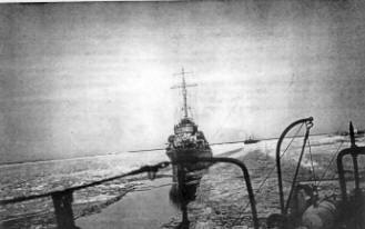 Halcyon class minesweepers lead a convoy through pack ice off the Russian coast during the winter of 1941/42 with two elderly freighters astern.